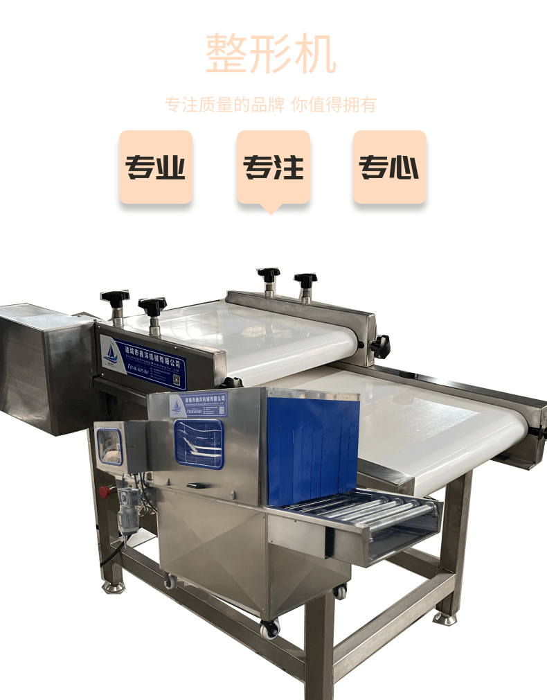食品整形機(jī)于軟包裝的金針菇、紅油筍絲、牛板筋、海帶絲、榨菜、醬菜、腌漬菜、蘿卜絲等,需要這種設(shè)備的產(chǎn)品大都包裝袋有透明區(qū)域,需要整形機(jī)將食品擠壓平均,讓其美觀大方有充實感并且方裝箱。該整形機(jī)由人工布料,經(jīng)過上下層皮帶整壓以后,把軟包裝的高凸部分壓平,此設(shè)備壓料的厚度可根據(jù)不同的包裝上下自由調(diào)節(jié),調(diào)節(jié)范圍15克/袋-5000克/袋。